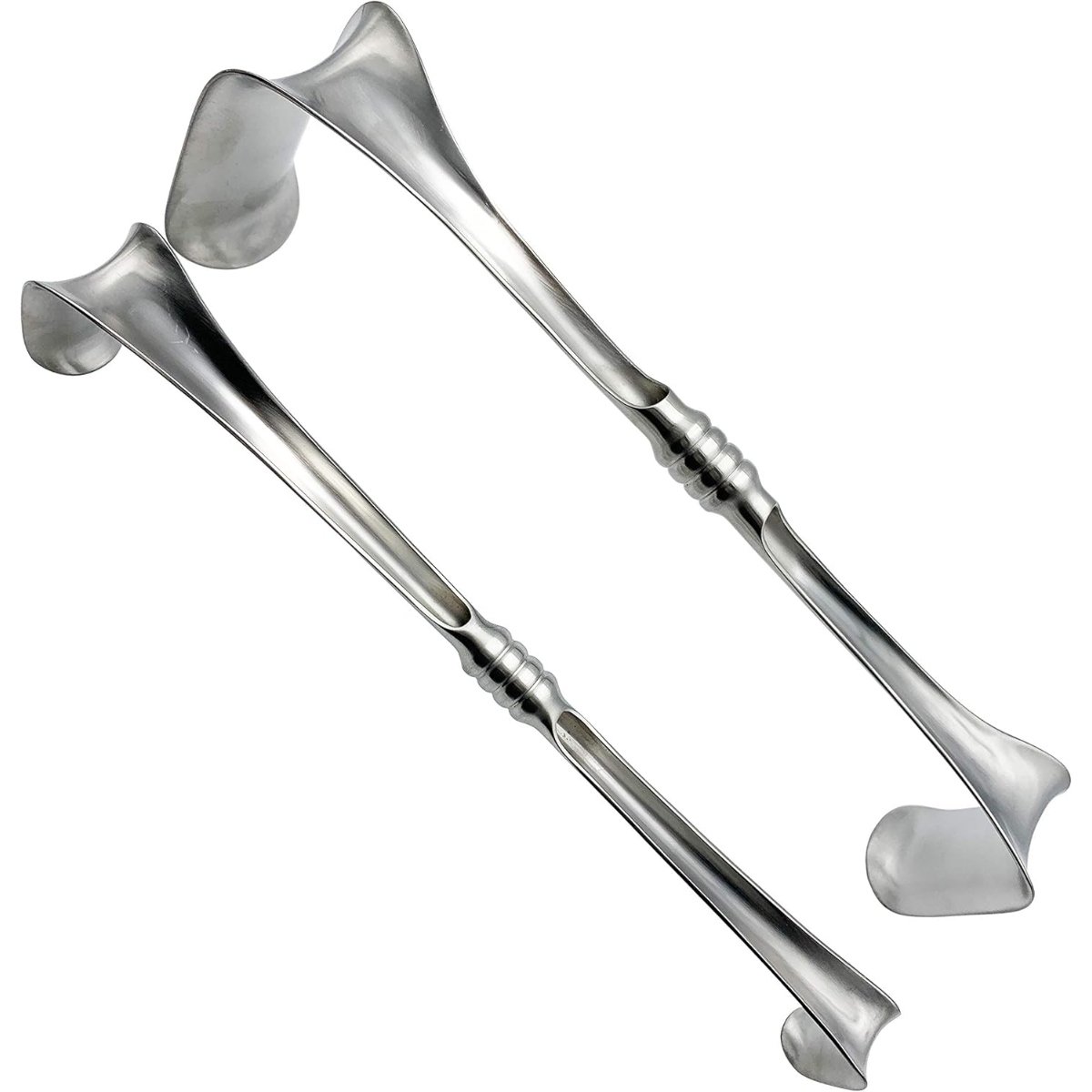 This retractor features double-ended blades in two size combinations: 65×50 mm / 55×38 mm and 35×28 mm / 30×20 mm, allowing versatility for different surgical needs. The long 28 cm length ensures optimal reach and control during procedures.
